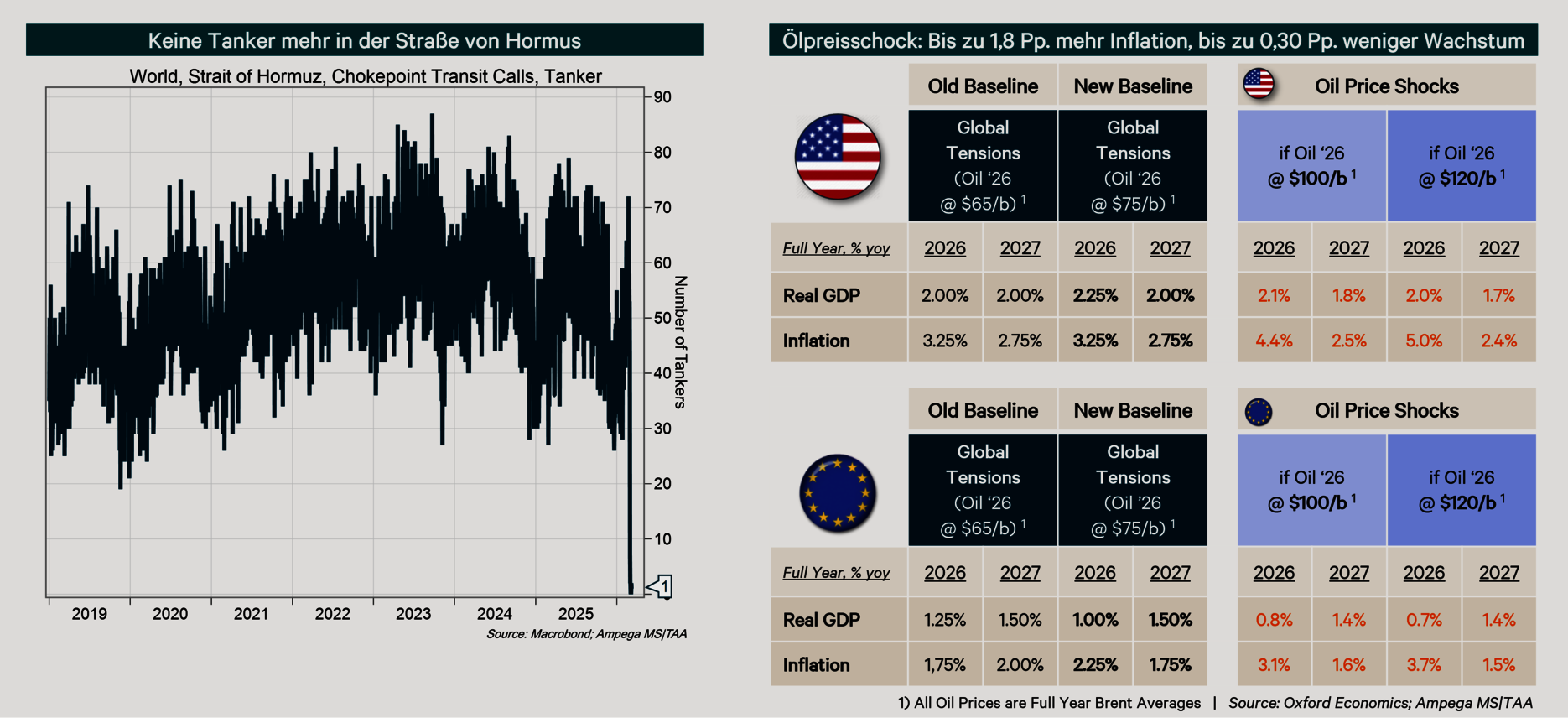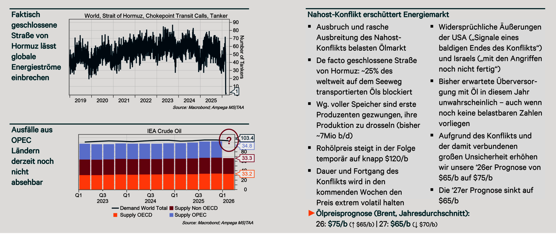 - Permanent wechselnde Nachrichtenlage: Andauernde Angriffe von USA und Israel, Iran greift Öltanker in der Straße von Hormuz und Anlagen in Nachbarländern an, angebliche Seeminen, brennende Ölfelder und eingeschränkte Produktion von Öl und Gas